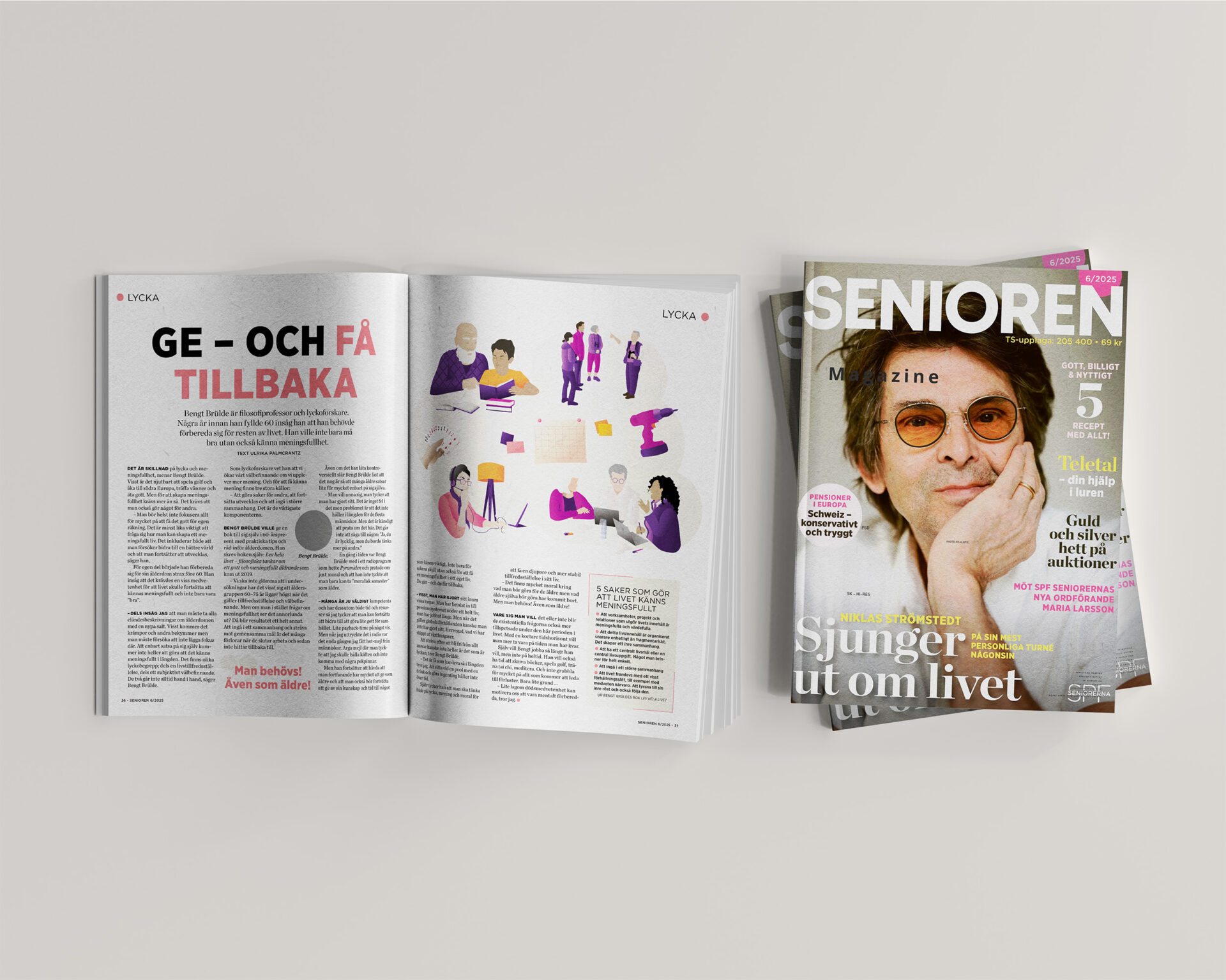 For an article about how to stay happy in later life, I was commissioned to create an illustration for SPF Seniorerna’s member magazine Senioren #6, that felt warm and lighthearted without becoming a cliché. I started with sketches and ideas on paper, then continued digitally in Procreate and Illustrator. The color palette was based on Senioren’s existing brand colors to maintain consistency with the magazine’s visual style. The result was an illustration that fit beautifully with the article – and a smooth, enjoyable collaboration with the editorial team.