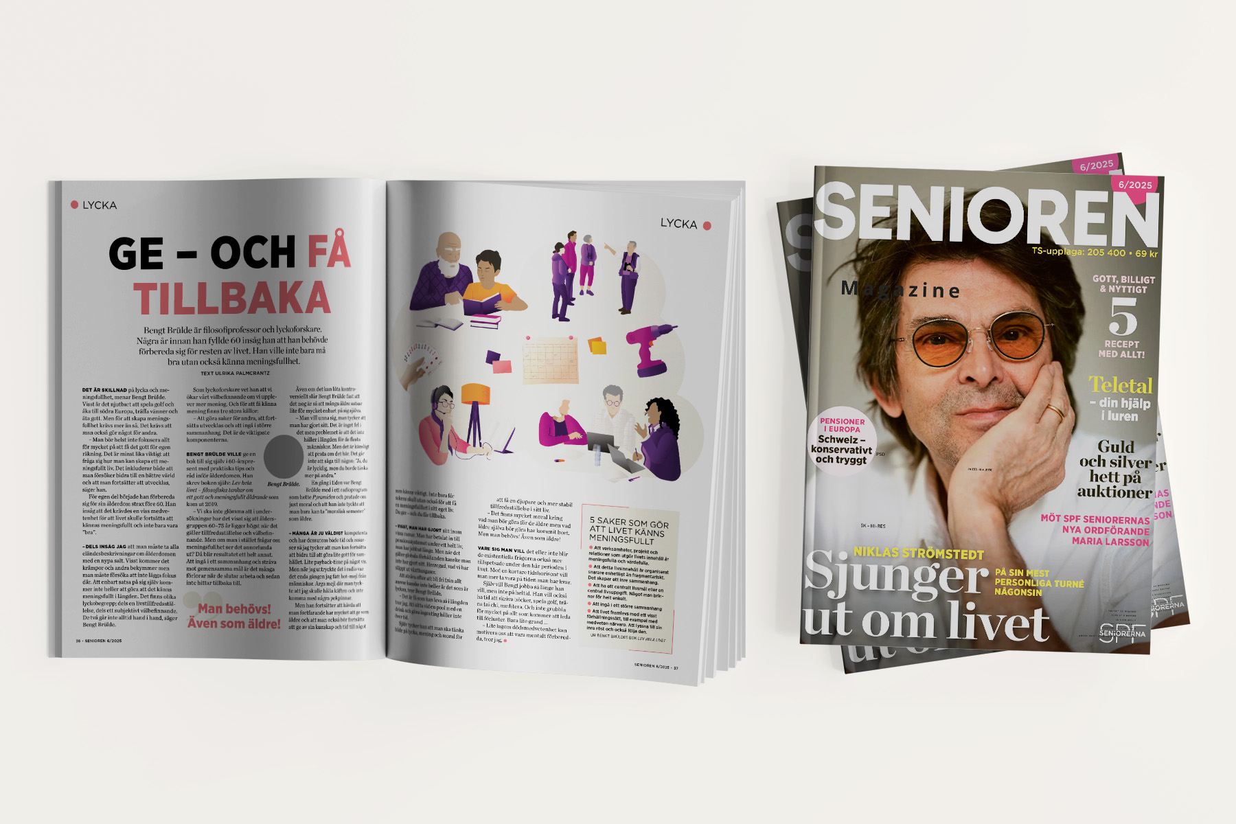 Till en artikel om hur man kan hålla sig lycklig som äldre, i SPF Seniorernas medlemstidning Senioren #6, fick jag uppdraget att skapa en illustration som kändes varm och lättsam utan att bli stereotyp. Jag började med idéarbete och skisser för hand, och arbetade sedan vidare digitalt i Procreate och Illustrator. The color palaFärgvalet utgick från Seniorens befintliga palett för att hålla enhetligheten i tidningens uttryck. Resultatet blev en illustration som passade fint in i artikeln – och ett smidigt samarbete med redaktionen.